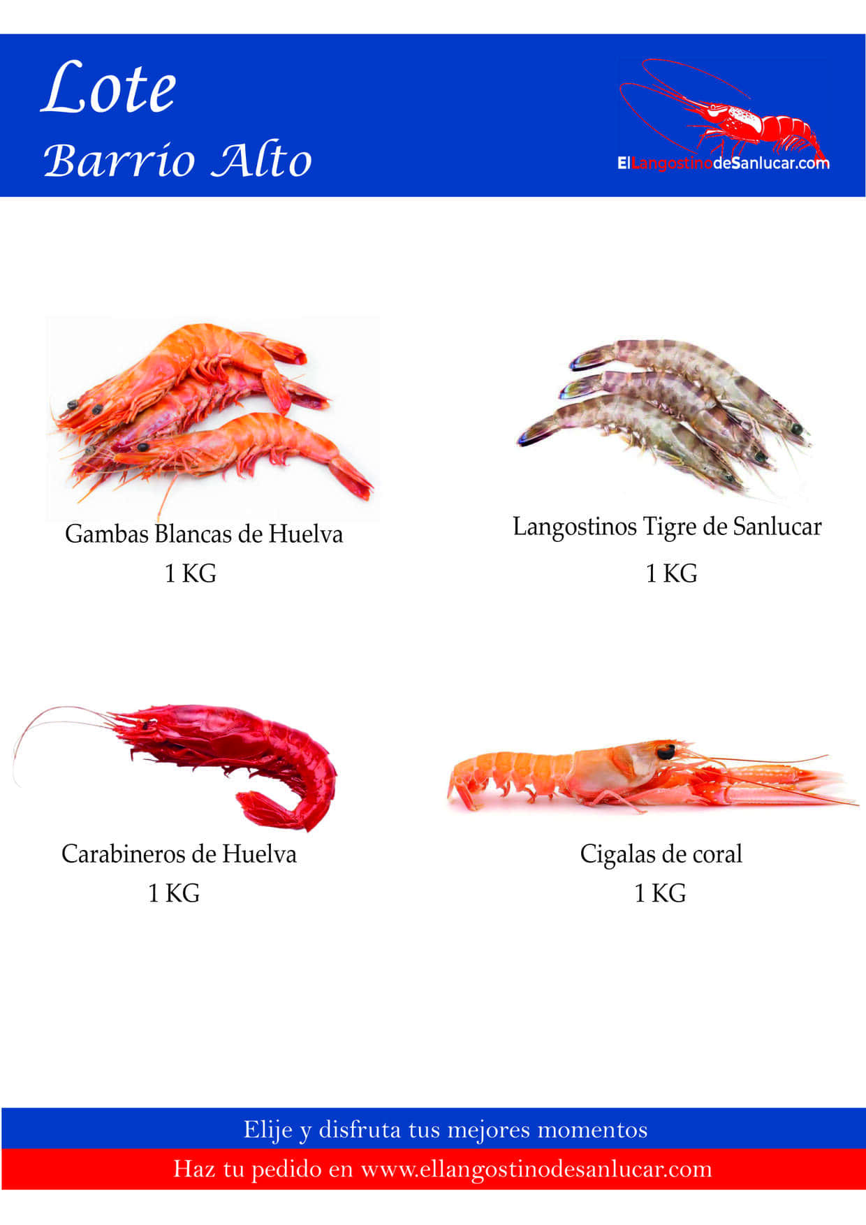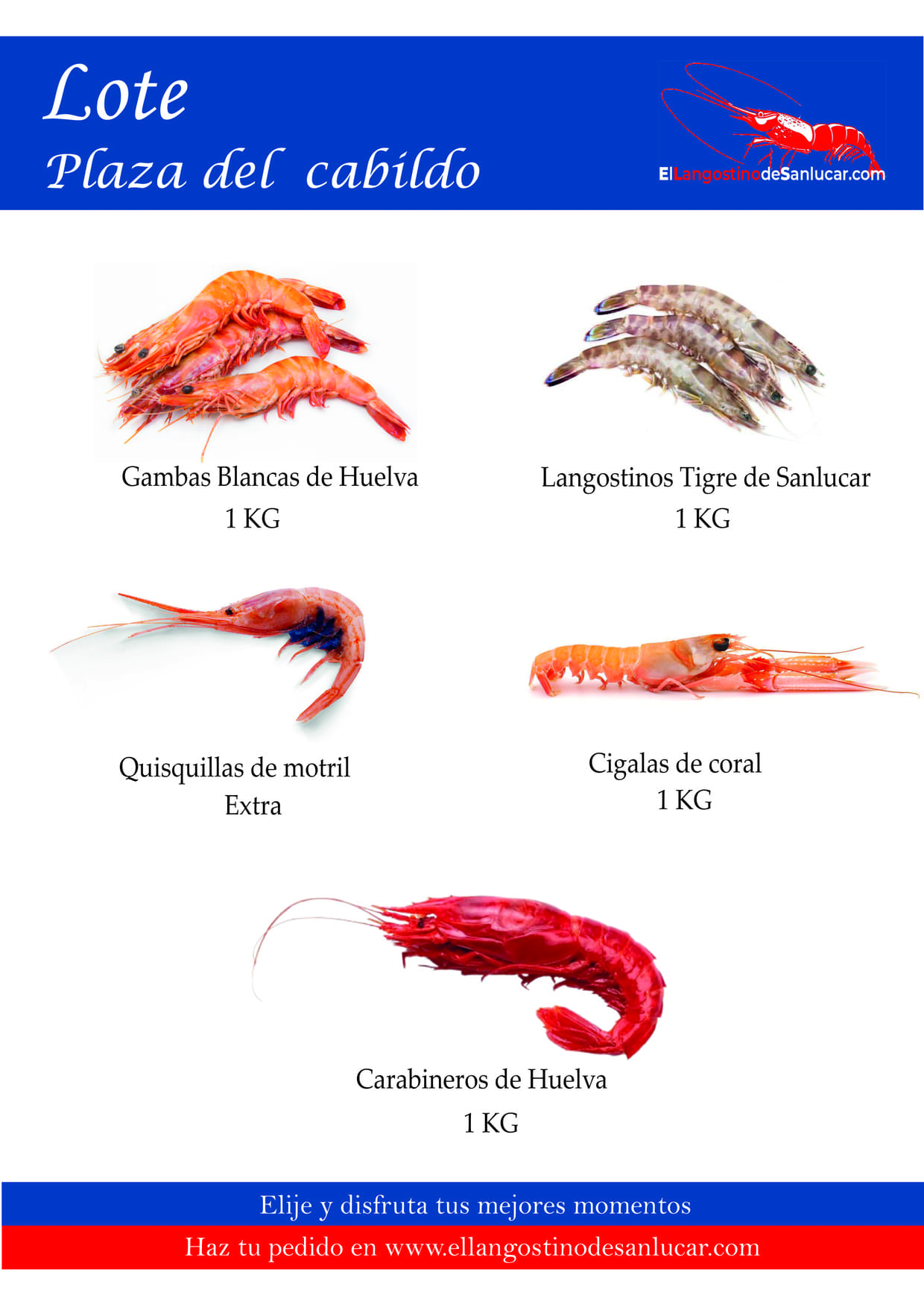 Marineros de la cofradía gaditana de Sanlúcar de Barrameda se afanan en la zona FAO27 para pescar en el Golfo de Cádiz y el mar de Huelva a la reina del marisco, la gamba blanca, así como al langostino de Sanlúcar, la cigala de coral, el bogavante azul, el carabinero o «chorizo» y la langosta. Ahora puedes recibir el mejor marisco a domicilio.